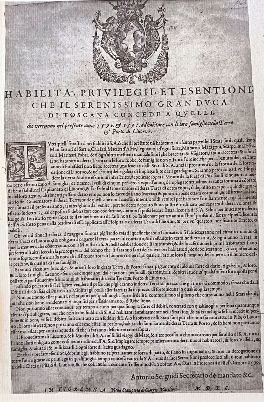 Habilità, privilegi et esentioni che il serenissimo Granduca di Toscana concede a quelli che verranno nel presente anno 1590 et 1591 ad habitare con le loro famiglie nella terre et porto di Livorno