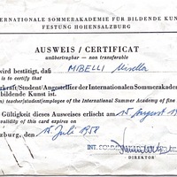 "Es wird bestätigt, dabs Mirella Mibelli Student der Internationalen Sommerakademie für bildende Kunst ist.. Die Gültigkeit dieses Ausweises erlischt am 15 August 1958. Salzburg, den 18 Juli 1958. Direktor (firma non leggibile)"