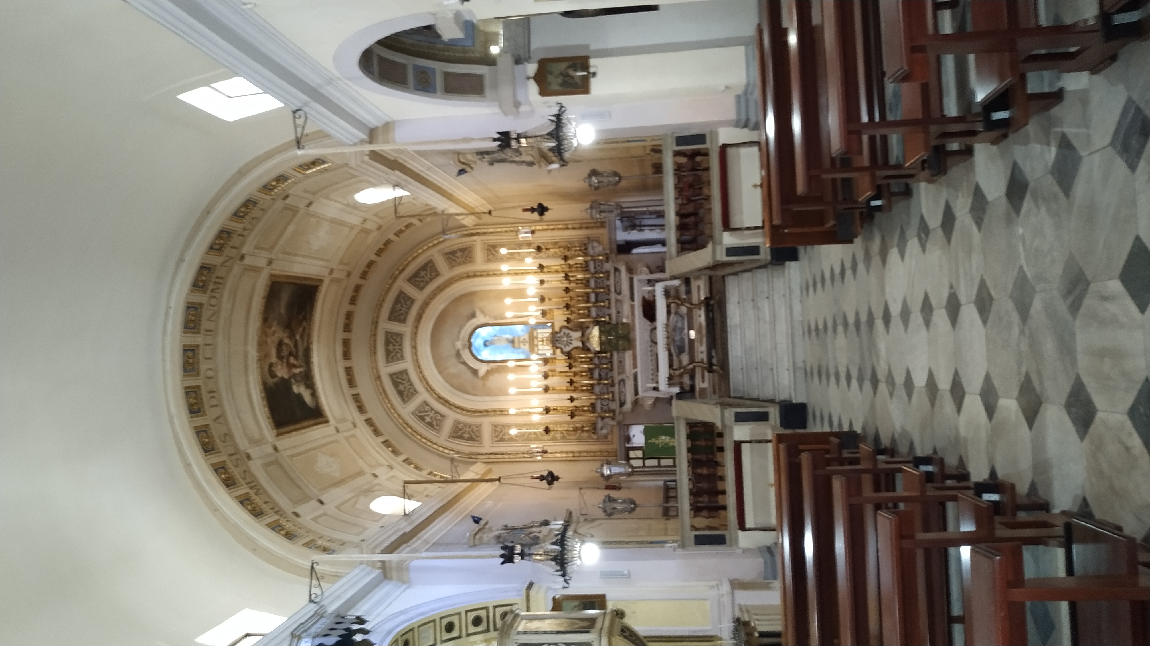 L'interno è a pianta rettangolare mononavata con tre cappelle per lato e presbiterio rialzato, l'aula e il presbiterio sono voltati a botte impostata su cornice aggettante così come le cappelle assidue;