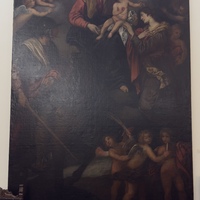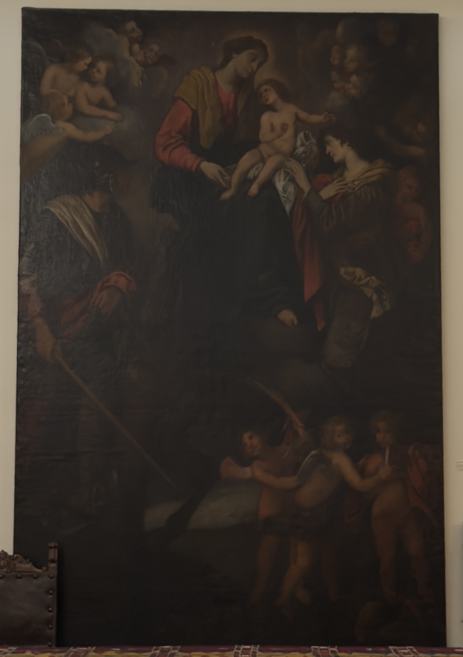 Dipinto Madonna col Bambino fra i Santi Caterina d'Alessandria e Giorgio, originariamente collocato nell'altare maggiore della prima chiesa dell'Arciconfraternita dei Genovesi, situata in Via Manno Cagliari dal 1599 al 1943.