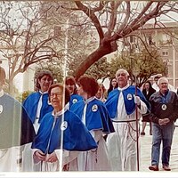 Confratelli della Santissima Vergine d'Itria in processione con gli abiti tradizionali: mantellina blu e tunica bianca.