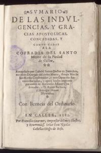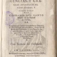 Sumario de las indulgencias, y gracias apostolicas, concedidas, y comunicadas ala confradia del santo Monte de la Piedad de Caller, recopilado por Gabriel Sanna doctor en derechos, entoncens diputado del dicho Monte, siendo Blas de san Martin conseruador, y otro diputado Antonio Baccallar, y agora echo imprimir por orden de Ambrosio Assator conseruador, y d. Anton Barbara, y Antiogo Atzori diputados