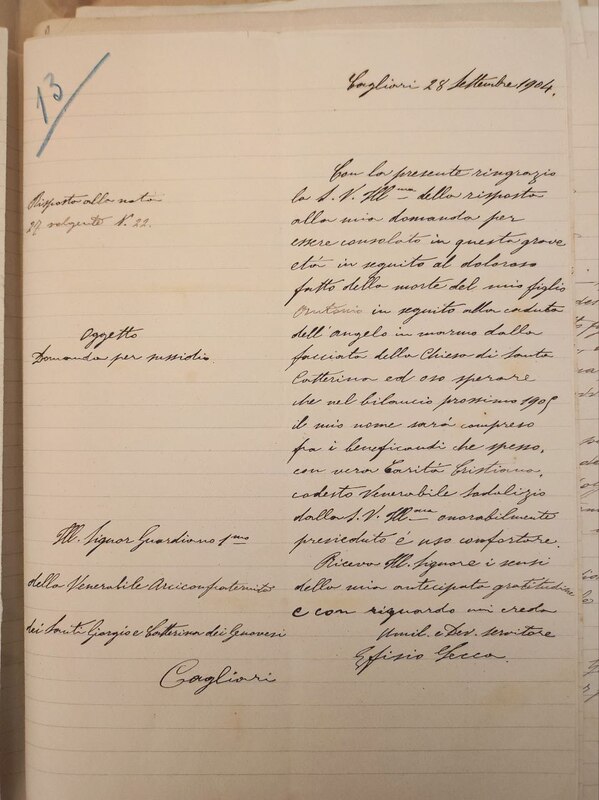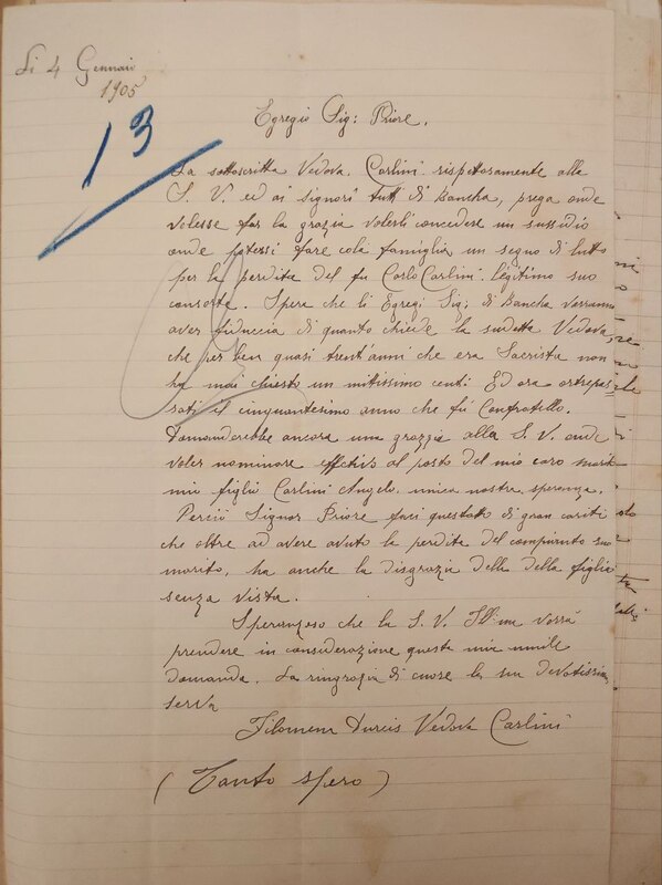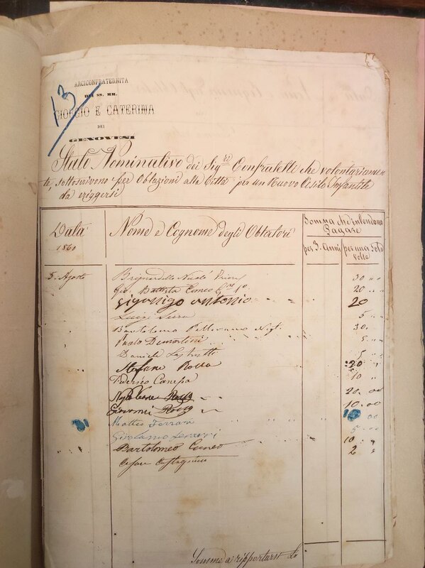 Nello specifico ho preso visione di tre documenti, del 1860, 1904 e 1905 che testimoniano le donazioni volontarie dei confratelli per la costruzione di un asilo infantile in città, il ringraziamento da parte di un cittadino per l’accettazione della sua domanda di sussidio e la richiesta di un sussidio da parte di una vedova di un confratello defunto.