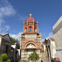 Dopo aver superato l’ingresso, caratterizzato da imponenti semicolonne che racchiudono un arco a tutto sesto, il mio sguardo viene immediatamente catturato da una tomba di famiglia, maestosa, sormontata da una cupola e policroma, che viene annoverata tra i sepolcri costruiti nei primi decenni del cimitero e che, come altre architetture presenti all’interno, è molto simile a sepolcri preesistenti, in questo caso a una tomba familiare realizzata dall’architetto Luca Beltrami nel cimitero monumentale di Milano.